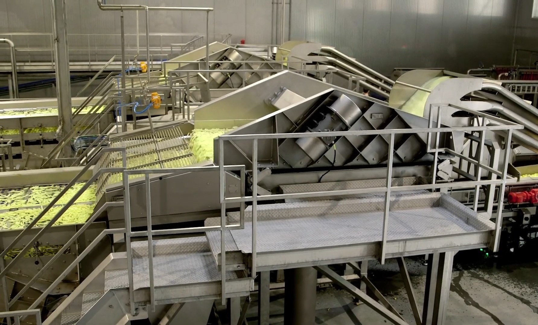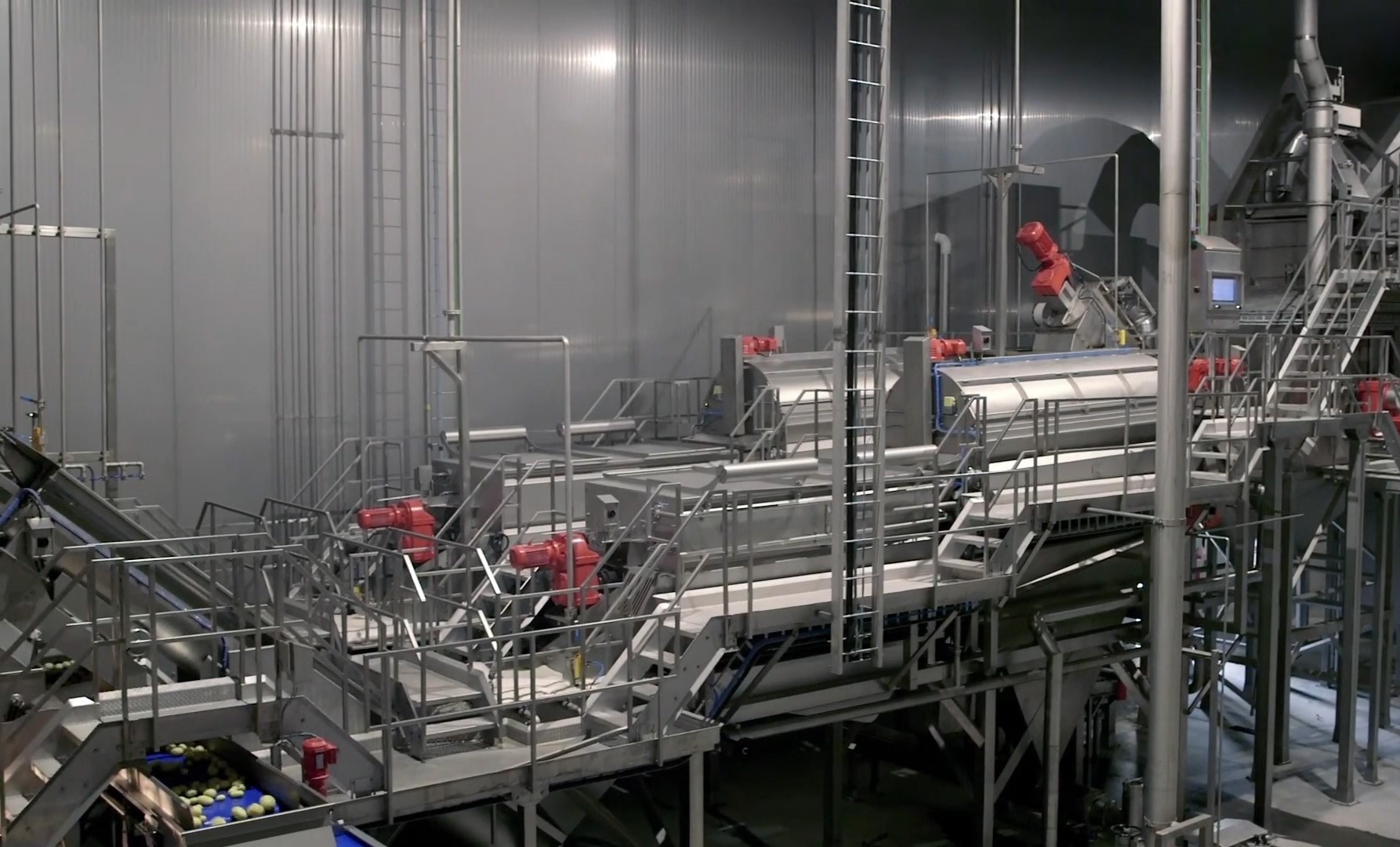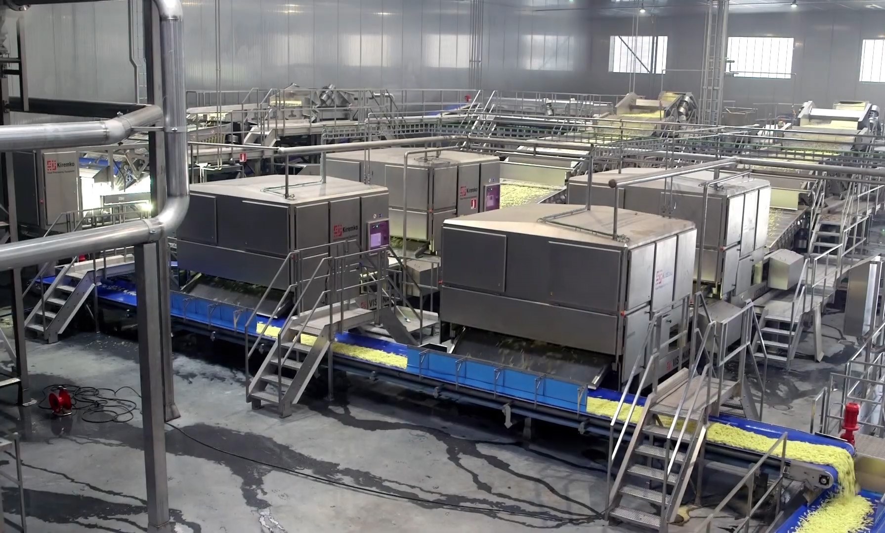 The production line includes receiving, steam reeling, cutting and grading, optical sorting, blanching, dipping & drying, frying and defatting, control system, freezer.
